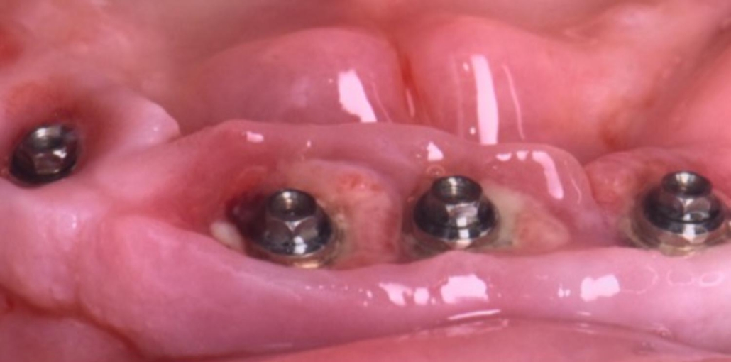 Autour d’un implant, on retrouve une gencive et un tissu osseux, tout comme autour d’une dent naturelle. Ces tissus peuvent être inflammatoires sous l’effet des bactéries présentes dans la bouche.